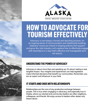 ATIA is proud to lead the state’s largest membership trade association for the travel industry. We are committed to sharing member stories, gathering visitor data, conducting industry research, and providing visitor statistics and toolkits so our members can help us share the message of the importance and impact of Alaska's tourism industry.